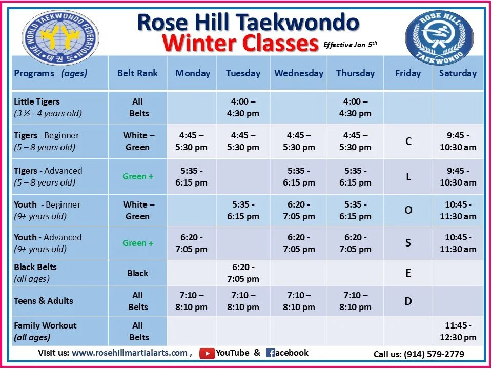 Rose Hill Taekwondo Winter Schedule