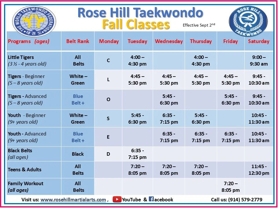 Rose Hill Taekwondo Fall Schedule